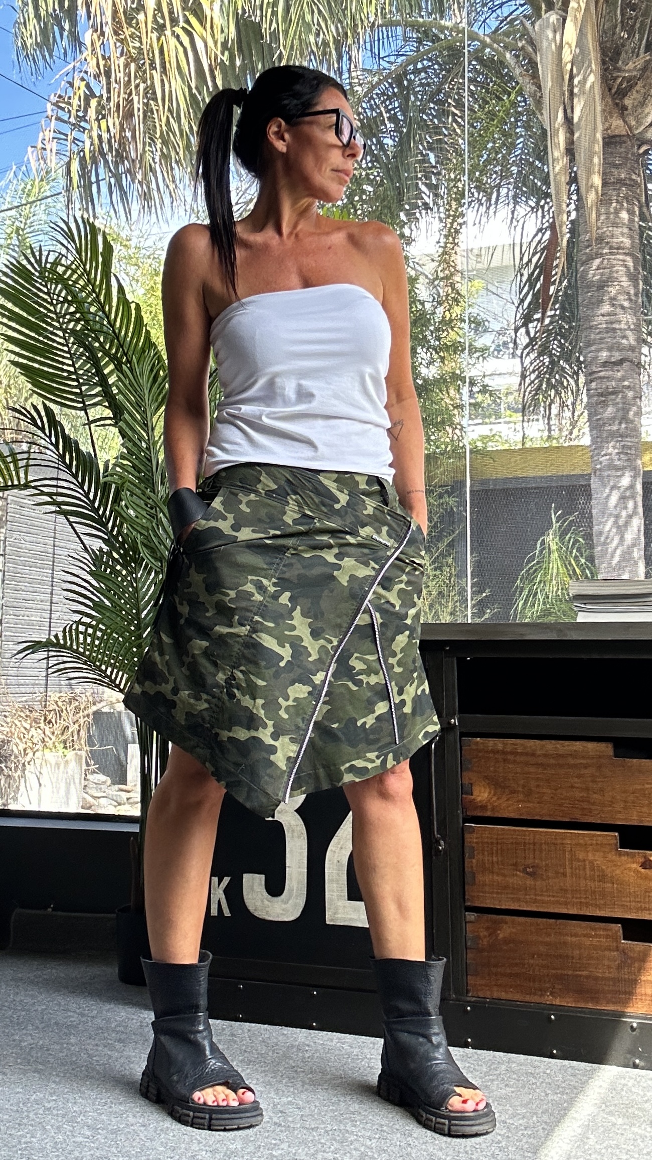La falda destaca por su estampado camuflado, un clásico que nunca pasa de moda y que aporta un toque urbano y moderno a cualquier outfit. Su corte está pensado para resaltar la figura, combinando comodidad y estética. Es perfecta para quienes quieren expresar su individualidad sin perder sofisticación.